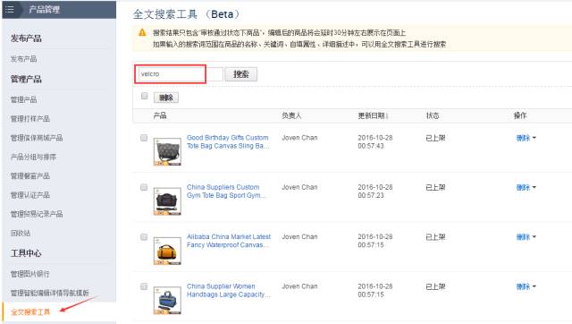 侵权被扣分是很多供应商都很苦恼的问题,以最近的侵权词“Velcro”为例,如果因为该词被扣分了,那就必须果断将后台中所有和“Velcro”相关的产品下架或者删除,以防多次掉进同一个坑里。这时候,“全文搜索工具”就派上大用场,直接搜索侵权词,然后全部删除。