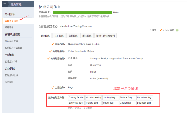其中的“更多经营产品”需要格外注意填写,必须填写贵司的主营产品关键词,因为利于在买家搜索供应商时,阿里巴巴为你进行系统匹配。同时,RFQ的配合,也会和这方面有关系。