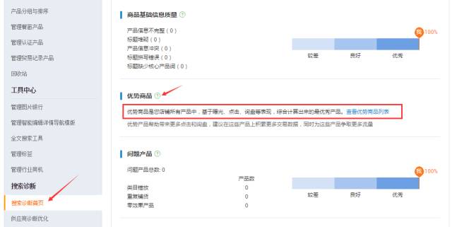 进入路径:“产品管理”-“搜索诊断”-“搜索诊断首页”-“优势产品”