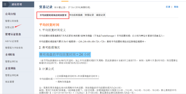 进入路径:“建站管理”-“贸易记录”-“平均回复时间和及时回复率”