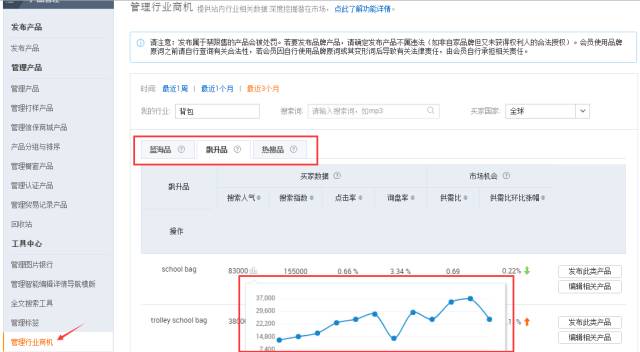 这个工具,就给大家提供了很好的参考,它提供了每个品类产品的搜索热度曲线变化,可以根据后台提供的“蓝海品”、“飙升品”、“热搜品”去确定目前重点覆盖的品类线。