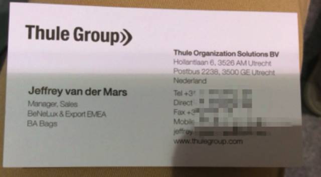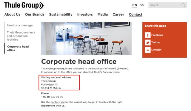 通过名片或者官网找到该买家的公司地址是:Thule Group,Fosievägen 13 ,SE-214 31 Malmö
