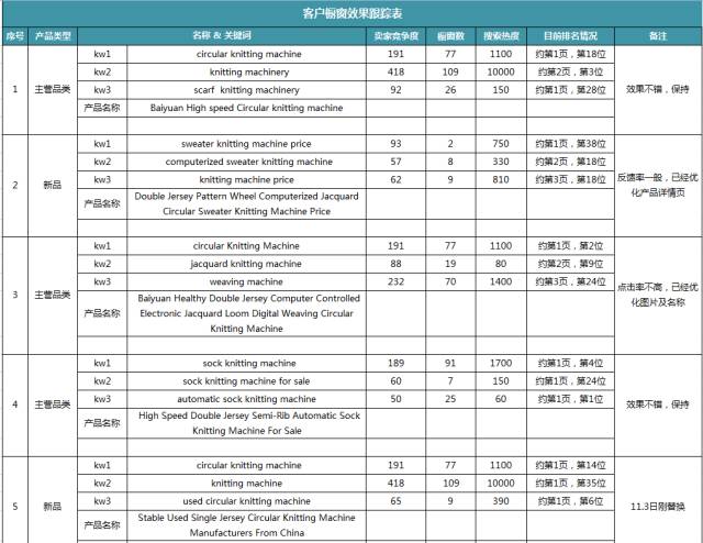 同时,对于行业的重点关键词,最佳状态是可以做到多页连排,在多个位置抢占曝光资源,多次出现吸引买家。所以,针对某些行业重点关键词,《关键词连排表》就必不可少,方便一目了然了解重点词的排名情况,同时联排也体现出一个运营人员的优化功底,如下: