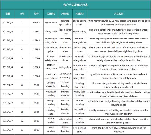 所以需要在发布每款产品的时候记录下产品的名称、关键词等,也能充分了解不同业务员发布产品的优化能力。